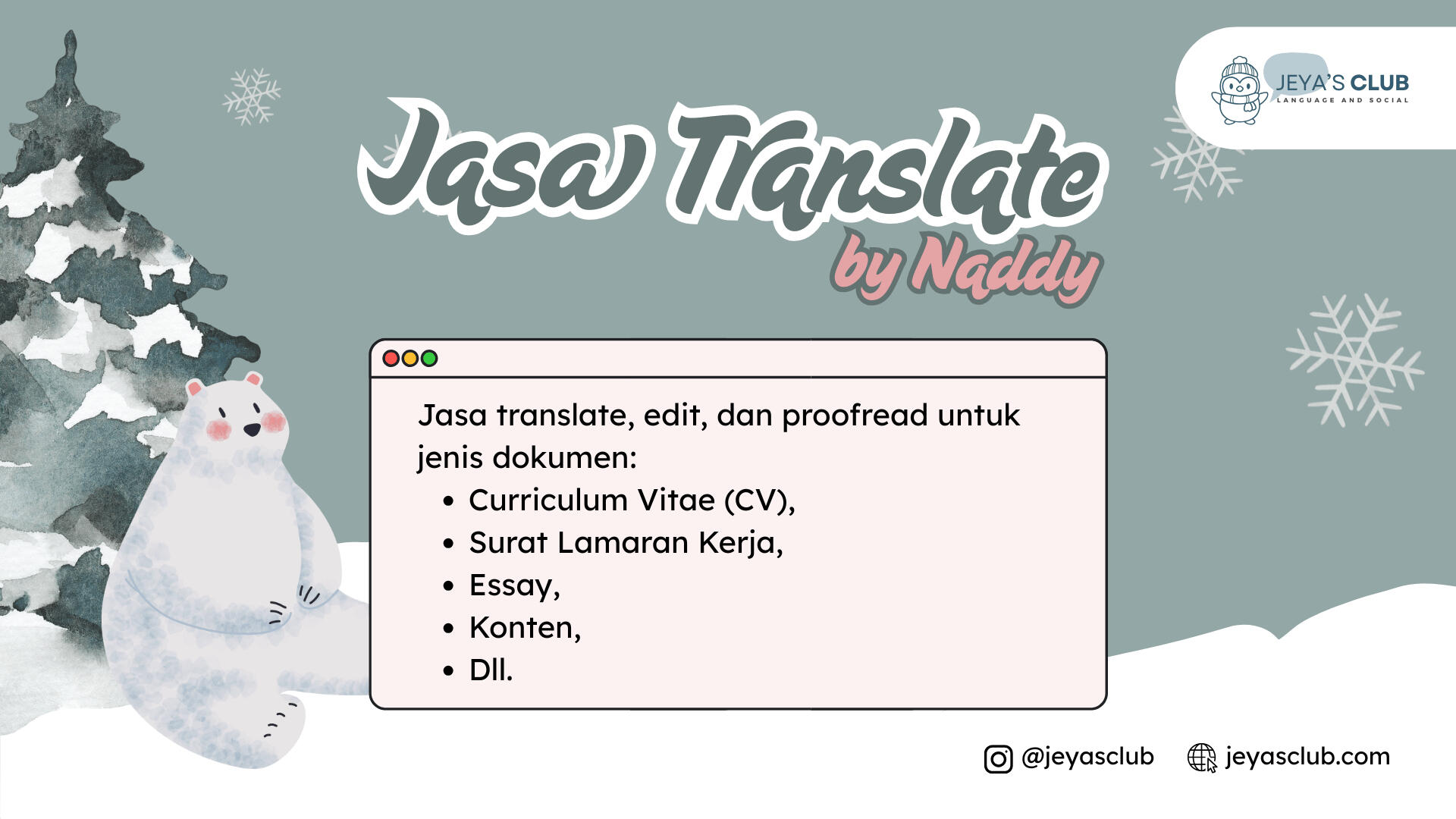 Kamu mau buat CV kamu lebih keren untuk melamar kerja? Atau kamu butuh jasa translate untuk dokumen-dokumen lain? Yuk translate dokumen kamu ke dalam bahasa Inggris bersama Kak Naddy!"Dokumen apa aja yang bisa ditranslate, Kak?"