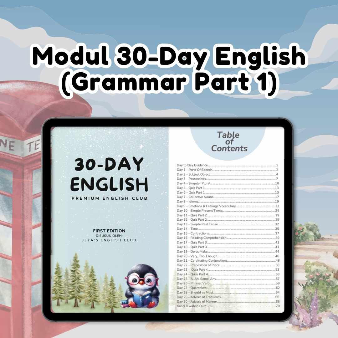 Kamu kesulitan untuk konsisten belajar Bahasa Inggris? Well, modul 30-Day English cocok banget buat kamu! Berisi materi belajar dari Day 1 - Day 30 yang bisa kamu ikuti, ada kuisnya juga loh. Belajar pasti jadi lebih seru!