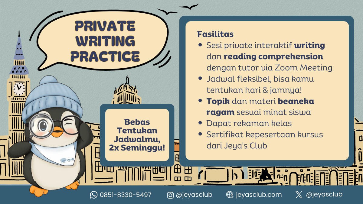 "Jeya's Club is my safe place to learn English! Aku sukaaa banget selama belajar disini. Jeya's Club tuh beneran memberi materi selama full seminggu, kita dibimbing, diberikan tugas, dan dikasih kebebasan untuk berdiskusi. Terus karena jeya's club channel Whatsapp juga aku jadi tau tentang hal yang baru, seperti slang atau hal-hal menarik lainnya seputar bahasa Inggris. Jeya's Club is so helpful for me, big thanksss!!"
