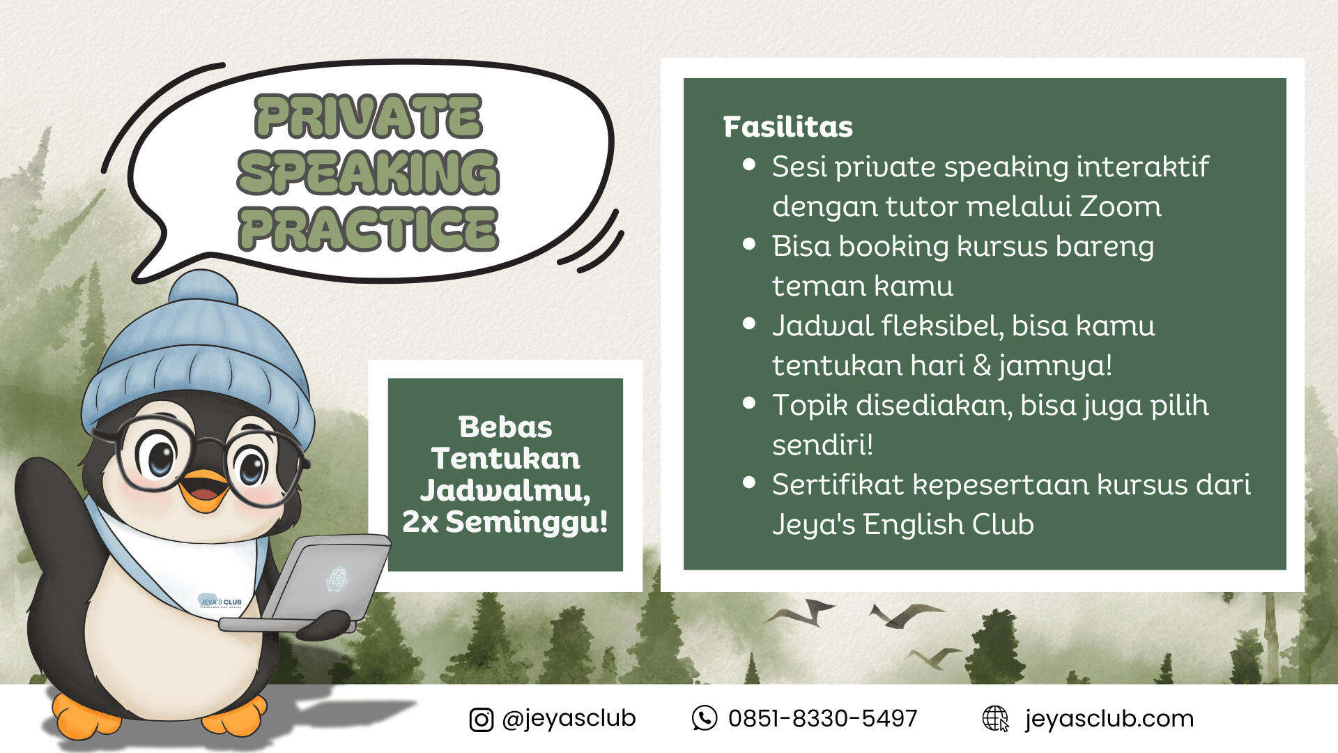 Sesi private speaking practice berdurasi 90 menit untuk setiap pertemuannya.