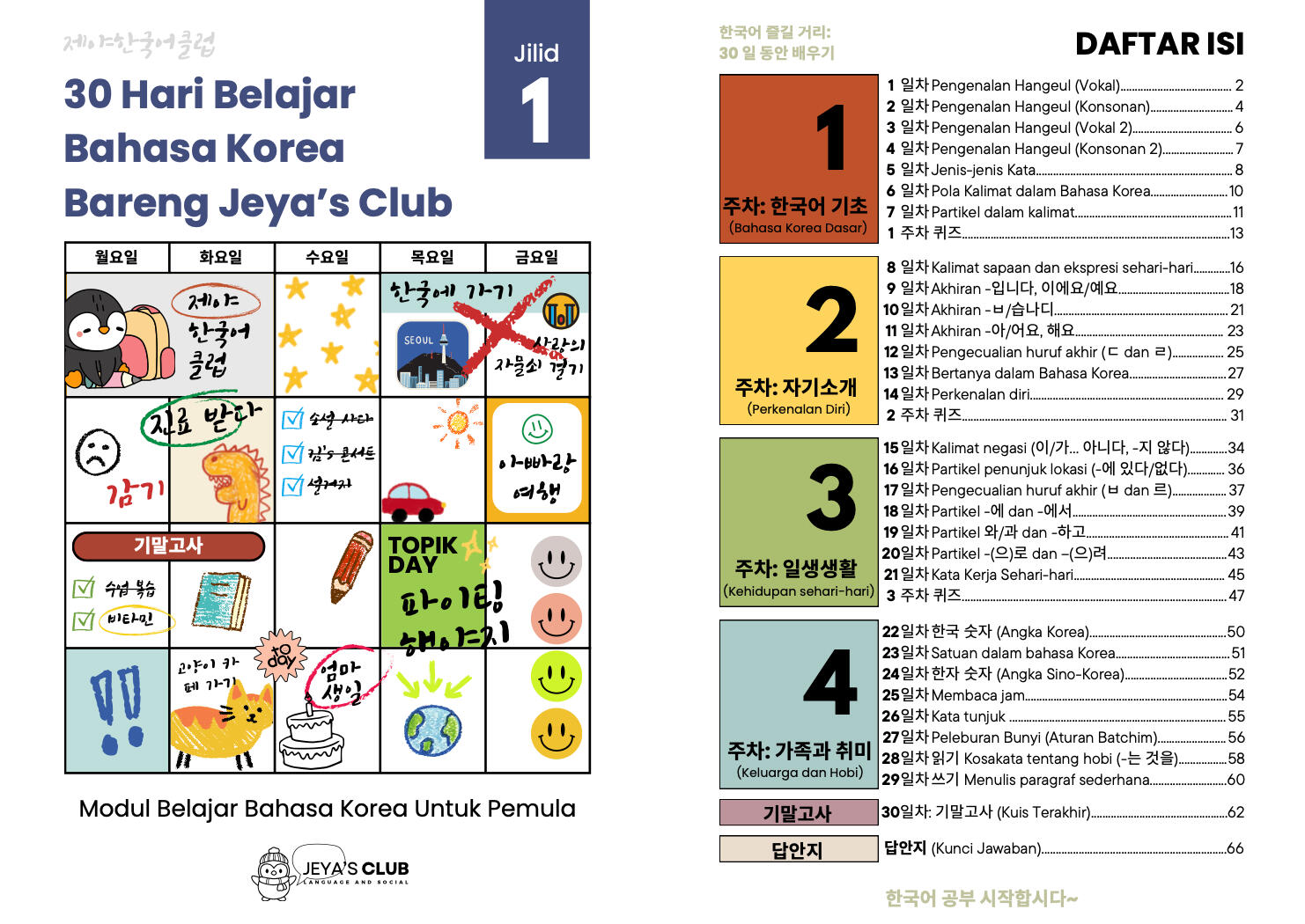 Untuk menjaga hak cipta, modul Jeya's Club tidak diperkenankan untuk didownload maupun diprint. Namun untuk modul 30 Hari Belajar Bahasa Korea kamu akan mendapatkan workbook yang bisa didownload dan diprint untuk latihan soal.