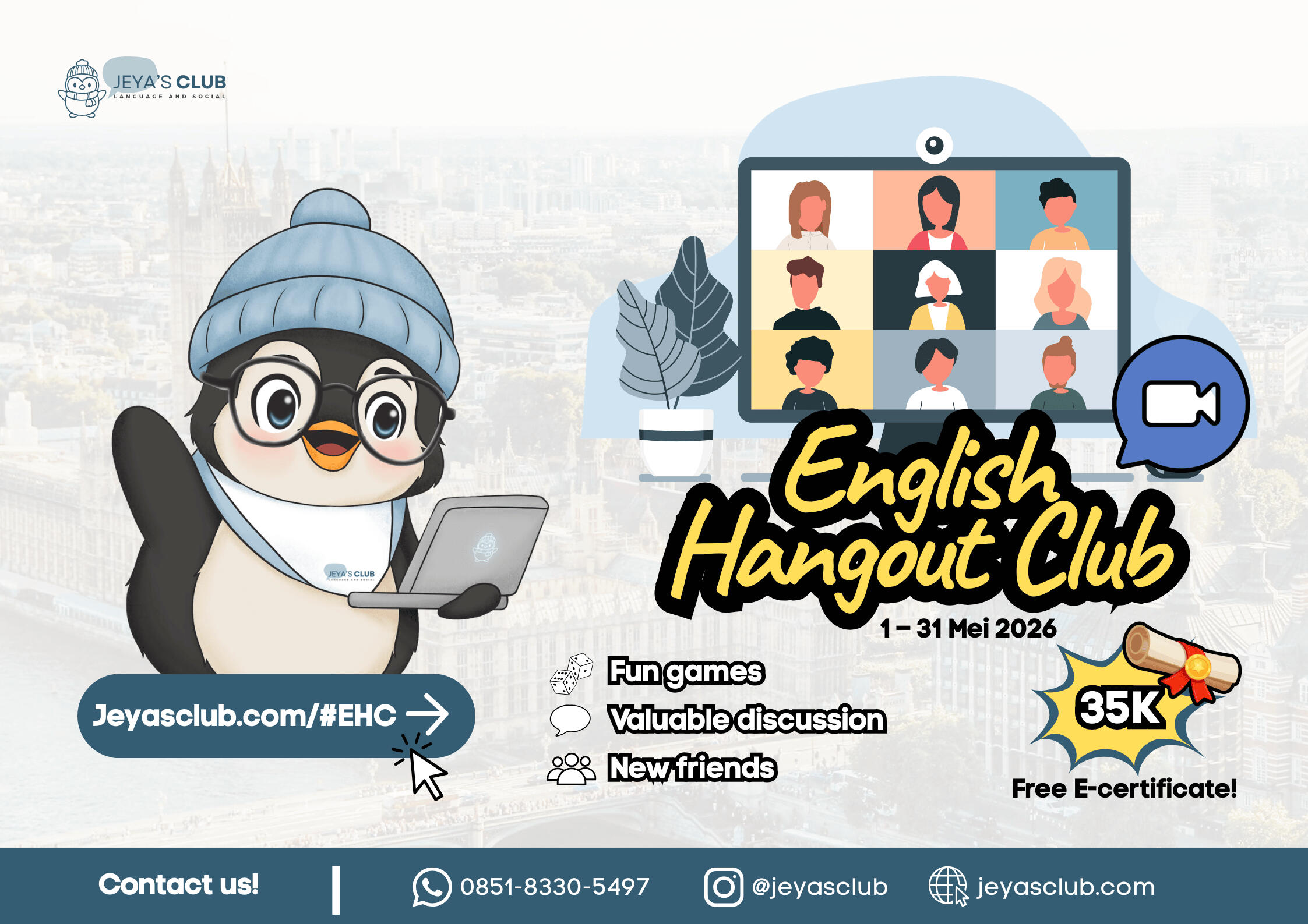 Hanya dengan Rp35.000 kamu udah bisa ikut total 8 pertemuan di Zoom, ikutan hangout, games, dan quiz seru lainnya di program English Hangout Club sepanjang bulan Mei 2026!
